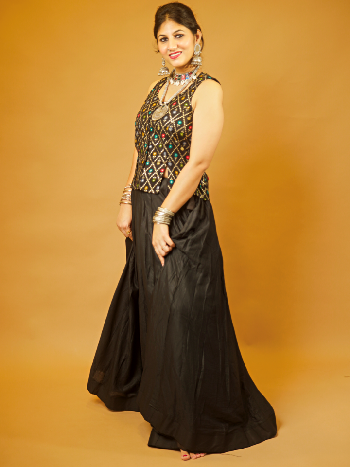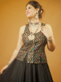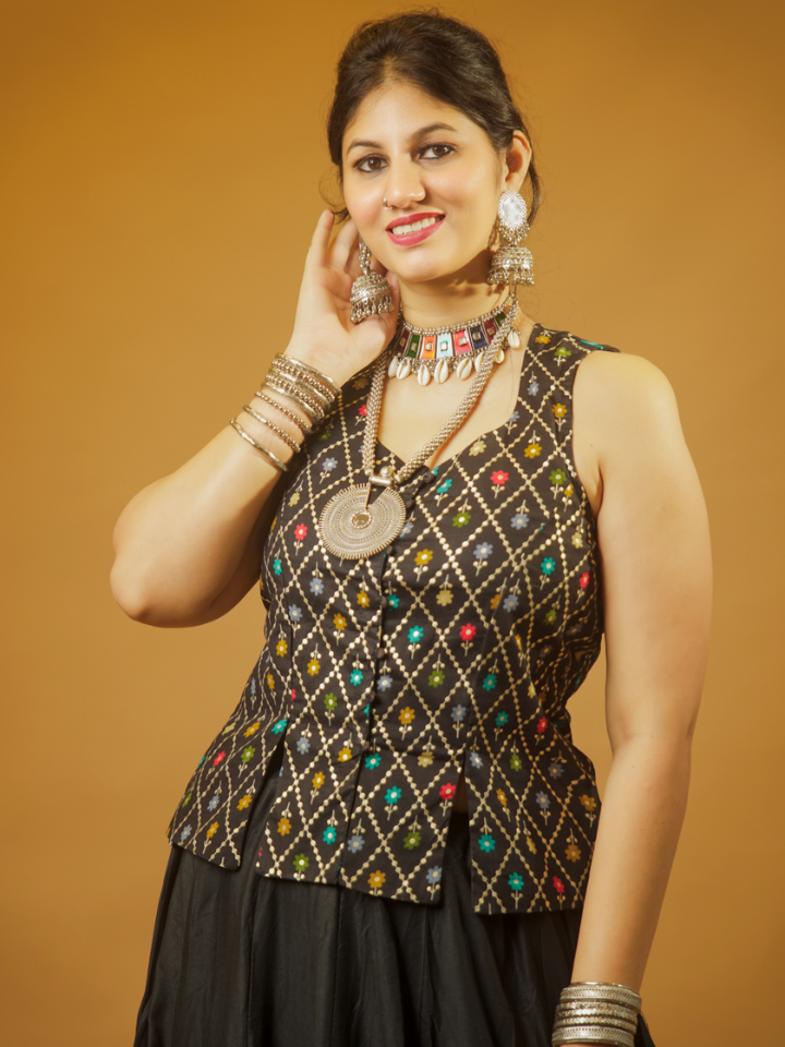 Crafted in pure cotton with festive floral prints, this sleeveless waistcoat features a unique flower-cut hemline that adds a playful twist. Perfect for layering over skirts, sarees, or even denims to create a bold yet graceful festive look.