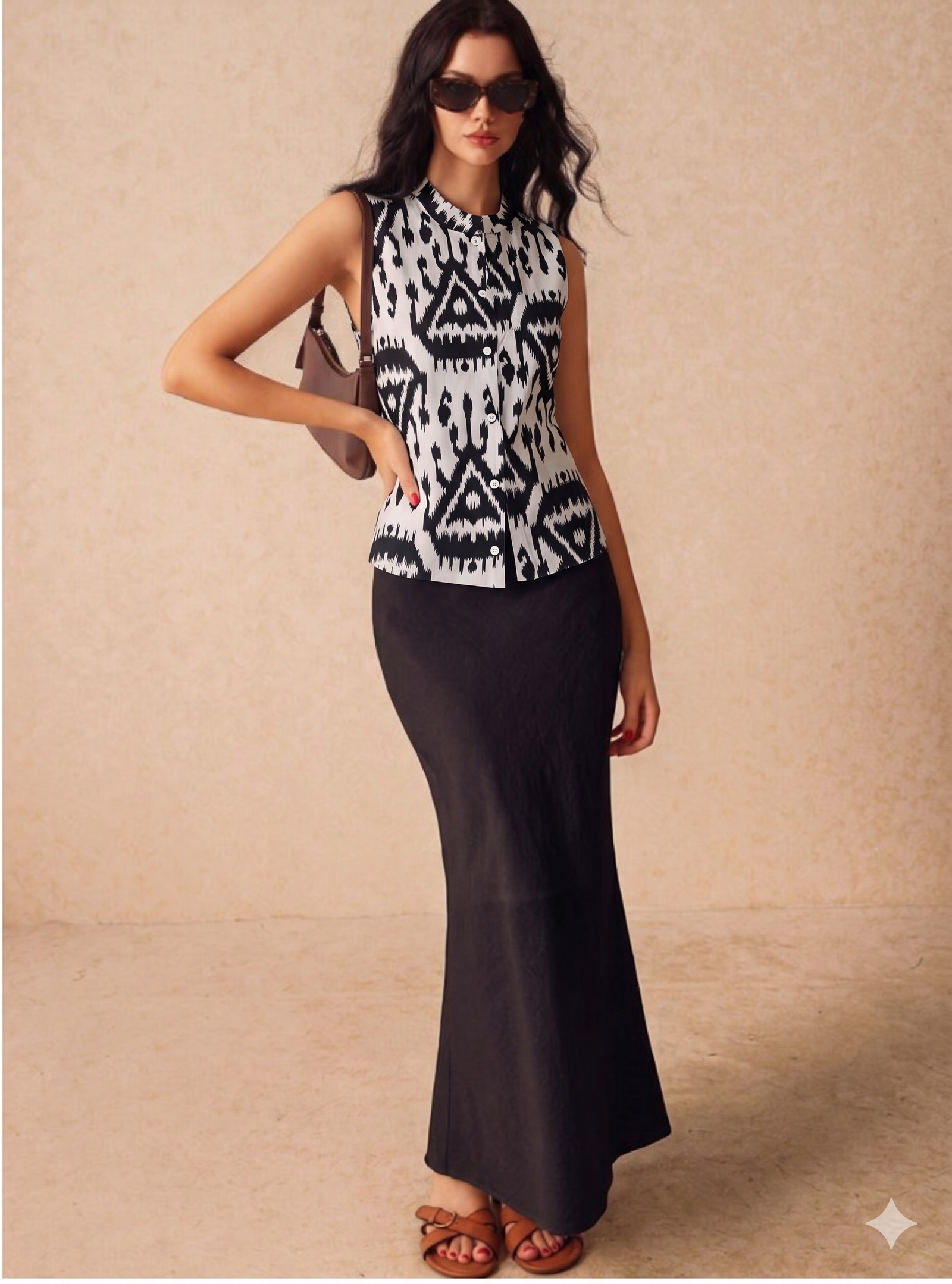 Timeless and versatile, the Midnight Ikat Waistcoat is a wardrobe essential with a contemporary edge. Featuring a classic black and white ikat-inspired pattern, it offers a bold yet minimal look.
