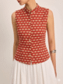 Details: Mandarin collar, sleeveless, front button closure