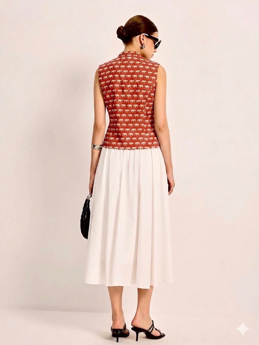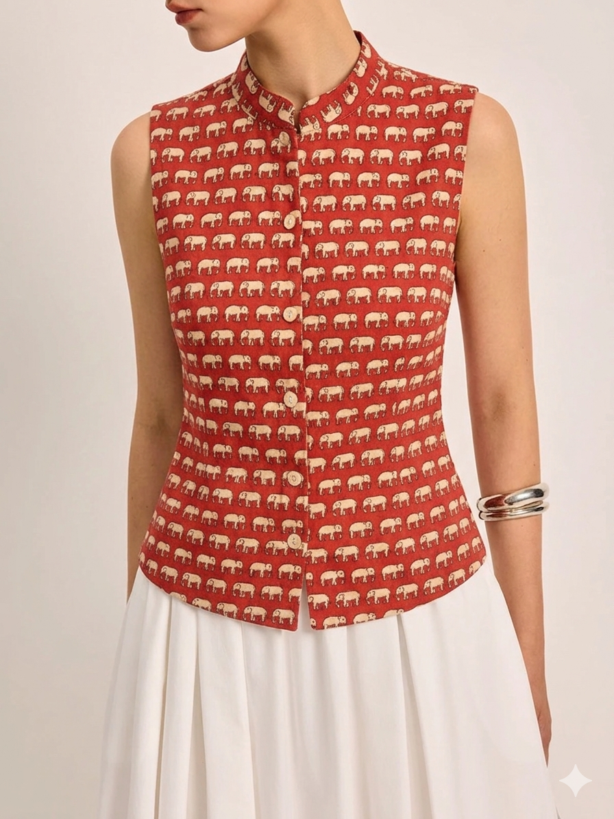 Bright, lively, and full of personality—the Coral Charm Waistcoat is your go-to for adding energy to any outfit. The geometric-inspired print on a warm coral base creates a modern yet playful aesthetic.