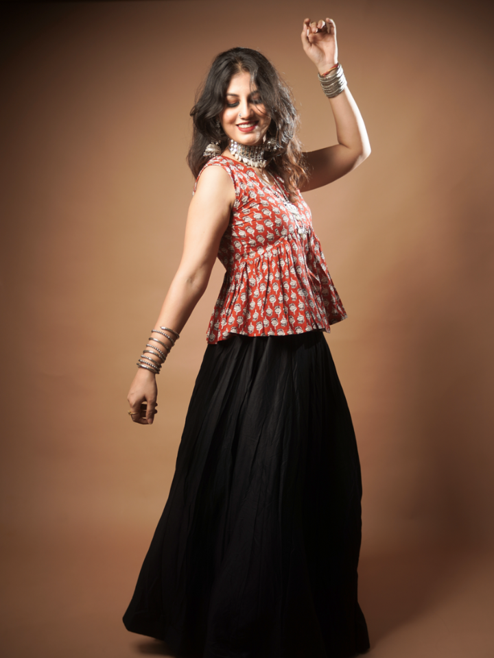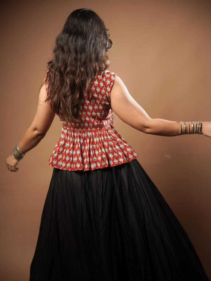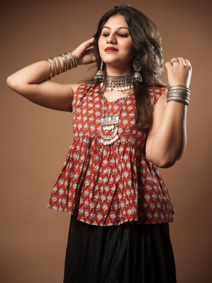 Made in soft breathable cotton, this sleeveless peplum top is all about comfort and charm. The rust base with delicate white florals makes it versatile for festive gatherings or casual outings.