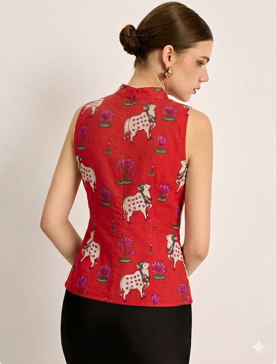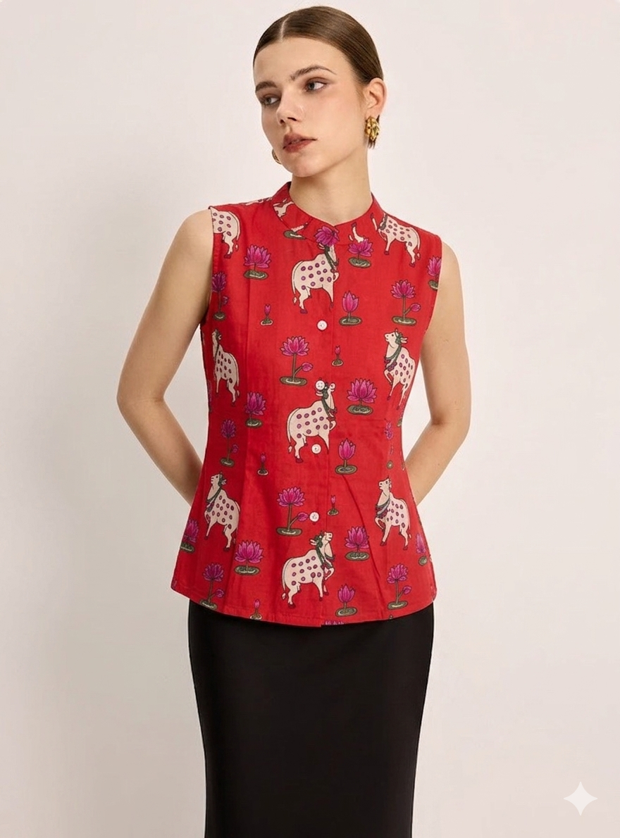 Playful yet bold, the Scarlet Safari Waistcoat is made to stand out. With its vibrant red base and unique animal-inspired prints, this piece brings a fun, statement vibe to your look.