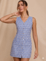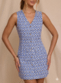 Description: A sleeveless, button-down mini dress featuring a plunging V-neckline and functional front patch pockets. The print consists of a repeating indigo and white ogee-diamond pattern.